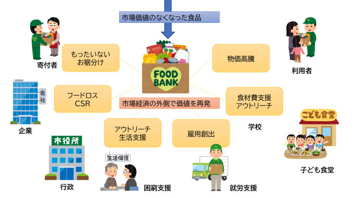 私が言いたいことは、上の見出しに書いた、〈フードバンクは「価値がない」とみなされた食品を通じて「価値を再度生み出す」活動〉ということです。少々ぎこちない言葉遣いですが、伝わればうれしいです。