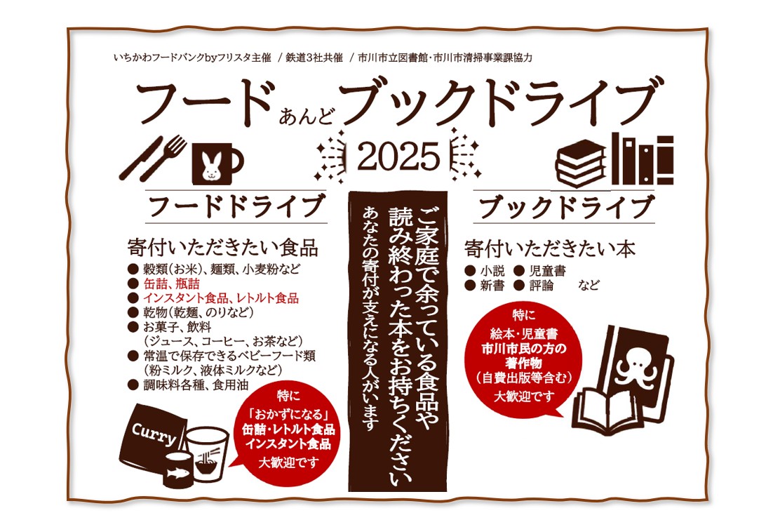 2025年11月15日(土)の10~13時にJR本八幡駅の改札外にブースを構え、ご不要な食品と本のご寄贈を受け付けます。お持ちいただいた食品は必要としている人たちに届けます!本も同様に有効に活用させていただきます。