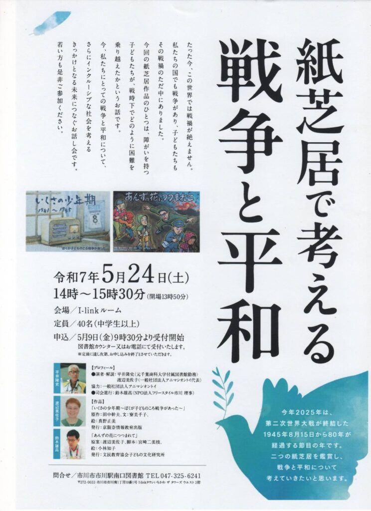 戦後80年となる今年、5月24日の14時より、JR市川駅の南口に出て左側(本八幡方向)に進んだ方のビルの3階にある「I-linkルーム(アイリンクルーム)」で、『紙芝居で考える戦争と平和』と題された集いが行われます。